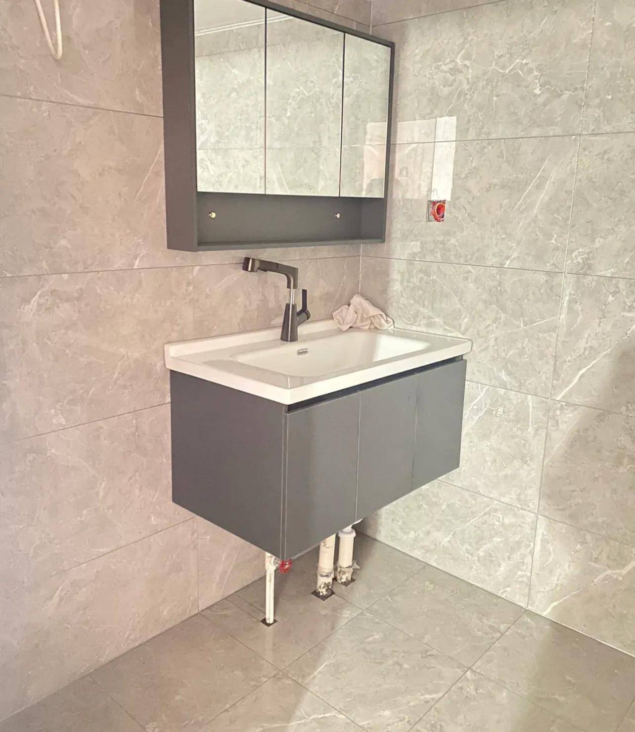 但问题就在于,如今大家清醒的认识到了落地浴室柜,有卫生死角的缺点,大都改用壁挂浴室柜了,再用地排就显得有点太丑了。